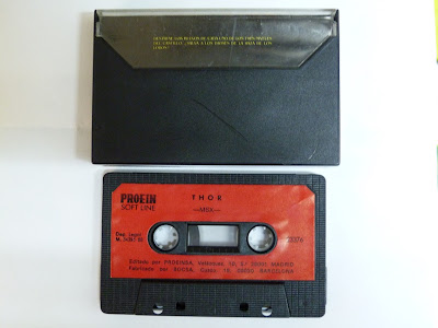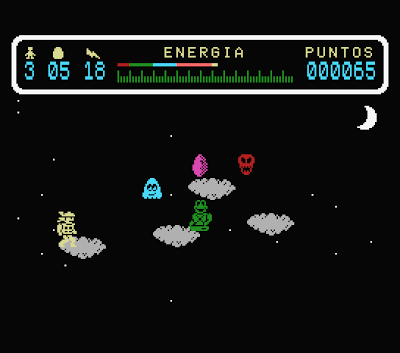 Y así comenzamos esta aventura con el Dios del trueno. En la parte superior tenemos un marcador con 5 vidas, los 10 huevos a encontrar, 5 rayos ( nos darán 3 adicionales por cada huevo destruido) y una barra de energía que menguará de forma vertiginosa si colisionamos con algún enemigo. Los controles son sencillos, cursores para moverse, barra espaciadora para golpear con el martillo y la tecla M para lanzar un rayo.