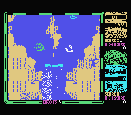 Tendremos que recorrer varios ríos diferentes intentando conseguir la mayor puntuación posible. Si pasamos por debajo de las banderas conseguiremos una buena cantidad de bonus. En el río también encontraremos tesoros, vidas extra y latas (son limitadas, en el marcador de la derecha viene la cantidad que tenemos).